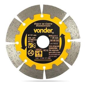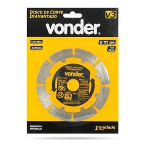 ---------------------------------------- Araújo Gouveia Ferramentas ----------------------------------- temos uma Equipe à sua Disposição. Será um imenso prazer fazer negócio com você ----------------------------------------------------------------------------------------------------------------------- Contém: - 1 Disco De Corte Diamantado 121mm Segmentado V3 Vonder Detalhes Técnicos: - Diâmetro externo: 121 mm - Diâmetro do furo: 20 mm - Tipo de corte: Refrigerado - Perfil do corte: Segmentado - Altura do segmento diamantado: 16 mm - Espessura do segmento diamantado: 1,9 mm - Rotação máxima rpm : 12600 /min - Segue norma: ABNT NBR 15545 Características: - Indicado para cortar concreto e alvenaria. Utilizado para reposição no cortador de parede VONDER CPV 3150. - Proporciona um corte de qualidade e alta produtividade no trabalho. Vantagens: - Alta Resistência e Durabilidade - Produto de Qualidade e ------------------------------------------------------------------------------------------------- -imagens Meramente Ilustrativas -O design do produto não interfere em sua funcionalidade -os produtos podem sofrer alterações no design pelo fabricante ------------------------------------------------------------------------------------------------- Marca: Não Informado Ean: 7893946565022