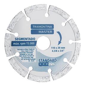 Corpo em aço liga especial; Têmpera total no corpo; Dureza diferenciada na área de corte; Velocidade máxima de trabalho 80m/s ? 15000 rpm; Com anel de redução; Tamanho: 4.3/8? Utilizados juntamente com serras mármores nos trabalhos de corte em concreto, rebocos, tijolos, refratários, basalto e outros materiais brutos que não necessitam alta precisão e qualidade no acabamento do corte. Proporcionam cortes com menor atrito, pois as gargantas entre os dentes eliminam o contato contínuo entre a banda de corte e o material, ajudando a refrigerar ambos. Pode ser utilizado para corte a seco sem risco de superaquecimento. Porém, sempre que possível, utilize refrigeração para elevar o rendimento do corte e a vida útil do disco. Devido a largura da linha de corte ser maior que a dos discos de banda lisa, o corte pode apresentar vibração. - Todas as ferramentas são produzidas e testadas conforme normas específicas. Quem trabalha com construção sabe que a qualidade das ferramentas é essencial para um bom rendimento, pensando nisso, o Disco de Corte Diamantado Segmentado 4.3/8 polegadas Tramontina Standard foi desenvolvido. Seu corte preciso é ideal para tijolos, basalto, refratários e demais materiais brutos. Quem conhece a tradição da marca sempre a quer como parceira.
