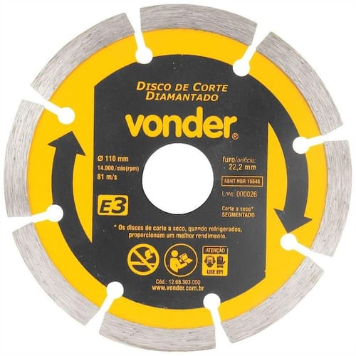 Disco de Corte Diamantado Segmentado Vonder E3 110 x 22,2mm - O disco de Corte Diamantado Segmentado Vonder E3 110 x 22,2mm é indicado para cortar mármore, granito, concreto, tijolo, telha, alvenaria e pedras. Os discos de corte a seco, quando refrigerados, proporcionam um melhor rendimento. Proporciona qualidade e produtividade na operação. Acompanha bucha de redução de 20 mm. Características Gerais do Produto: Marca: Vonder Modelo: E3 Referência: 12.68.303.000 Tipo: Segmentado Corte a Seco Altura do Segmento: 7 mm Diâmetro do Furo: 22,2 mm Indicado para: Corte de Cerâmica Rotação: Máxima: 14000 /min Diâmetro: 110 mm Espessura: 1,8 mm Norma: ABNT NBR 15545 Acompanha o produto: 01 Disco de Corte Diamantado Segmentado Vonder E3 110 x 22,2mm : 3 Meses Marca: Não Informado Ean: 7893946544102