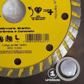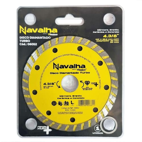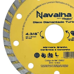 Disco de Corte Diamantado Turbo 110mm para Serra Mármore Titanium Disco com alta concentração de diamantes, indicado para corte de mármore, granito, cerâmicas e concreto. Para uso com Serra Mármore Makita e outras marcas . - Marca: Navalha/ Titanium - Referência: TT6052 - Diâmetro externo: 110 mm 4.3/8 polegadas - Diâmetro do furo do disco: 20mm - Acompanha anel para 16mm - Espessura: 118mm - Alta concentração de diamante - Indicado para corte de mármore, granito, cerâmicas e concreto - Para uso com Serra Mármore Makita e outras marcas - Rotação máxima: 13.800 rpm - Peso bruto: 90 gramas - : 90 dias contra defeitos de fabricação