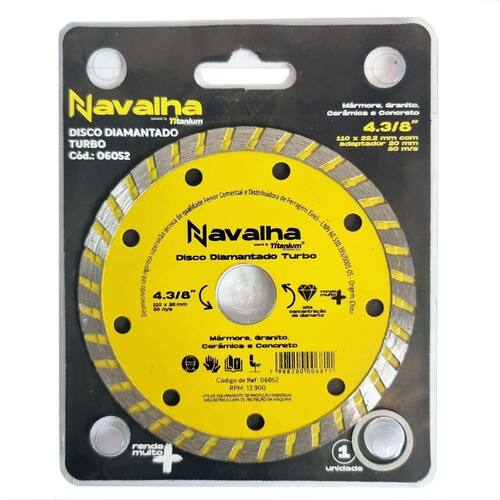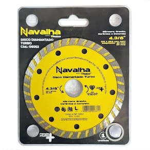 Disco de Corte Diamantado Turbo 110mm para Serra Mármore Titanium Disco com alta concentração de diamantes, indicado para corte de mármore, granito, cerâmicas e concreto. Para uso com Serra Mármore Makita e outras marcas . - Marca: Navalha/ Titanium - Referência: TT6052 - Diâmetro externo: 110 mm 4.3/8 polegadas - Diâmetro do furo do disco: 20mm - Acompanha anel para 16mm - Espessura: 118mm - Alta concentração de diamante - Indicado para corte de mármore, granito, cerâmicas e concreto - Para uso com Serra Mármore Makita e outras marcas - Rotação máxima: 13.800 rpm - Peso bruto: 90 gramas - : 90 dias contra defeitos de fabricação Marca: Não Informado