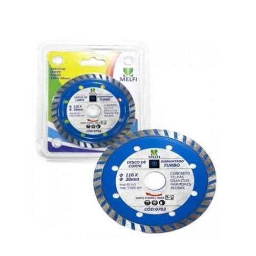 Disco Diamantado Turbo Dimensão 110,0 x 20,0mm Corpo em aço liga especial, Têmpera total no corpo, Dureza diferenciada na área de corte, Acompanha bucha de redução de 20 mm para 16 mm. Possui maior concentração de diamante, proporcionando alta performance. Aplicações: Utilizados juntamente com serras mármores nos trabalhos de corte em granitos, mármores, telhas, telhas de fibrocimento, basalto e outros materiais que não necessitam de um acabamento liso, mas que também não podem lascar ou apresentar rebarbas. Podem ser utilizados em cortes à seco. Porém, sempre que possível utilize refrigeração para elevar o rendimento do corte e a vida útil do disco.