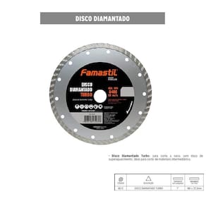 O Disco Diamantado Famastil possui gravacao a laser, corte seco e refrigerado. Um dos seus diferenciais esta na maior quantidade de diamantes para tornar o corte mais facil e rapido. Esta disponivel nos modelos: Turbo, Liso, Segmentado e Liso Porcelanato.