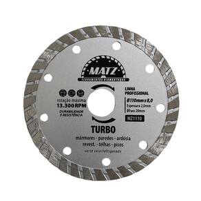 Informações técnicas: Perfil do corte: Turbo Diamantado Tipo de corte: A seco e refrigerado Dimensões: - Diâmetro externo: 110mm 4.3/8'' - Diâmetro do furo: 20mm - Perfil de corte: 8mm - Espessura: 2mm Rotação máxima por minuto RPM : 13.330 - 80m/s Para corte de: Mármores, paredes, ardósia, revestimentos, telhas e pisos Proporciona qualidade e produtividade na operação Produto de altíssima qualidade com alta performance