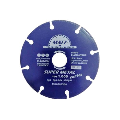 Informações técnicas: Tipo de corte: A seco e refrigerado Dimensões: - Diâmetro externo: 115mm 4.1/2'' - Diâmetro do furo: 22,23mm 7/8'' - Acompanha anel de redução para 20mm - Espessura: 1,4mm Rotação máxima por minuto: 13.200 - 80m/s Para corte de: Aço, aço inox, chapas e ferro fundido Proporciona qualidade e produtividade na operação Produto de altíssima qualidade com alta performance