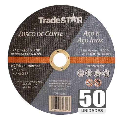 Tamanho: 7 polegadas (180 mm) Espessura: 1,6 mm Diâmetro do furo: 22,2 mm Máxima rotação: 8.500 RPM Material: abrasivo de alta qualidade e resina fenólica Indicado para corte em metais ferrosos e não ferrosos, aço inoxidável e materiais de alta dureza Excelente vida útil e capacidade de corte rápido e preciso Atende às normas de segurança da ABNT (Associação Brasileira de Normas Técnicas).