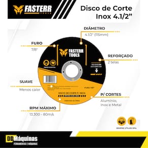 Se você busca cortes com acabamento impecável, o Disco Corte Inox Fasterr Tools FSTC01 é a escolha perfeita. Com alta precisão e corte rápido, ele minimiza a geração de calor, garantindo resultados superiores. Ideal para cortar aços e suas ligas, incluindo aços inoxidáveis, este disco é reforçado com 02 telas para maior durabilidade.
