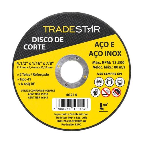 O Disco de Corte Metal 4.1/2 115x1,6 mm , a solução definitiva para profissionais que buscam potência e precisão no corte de metais. Com um diâmetro de 115mm e espessura de 1,6mm, este disco oferece cortes limpos e eficientes em uma variedade de materiais metálicos. Principais Características e Aplicações: Corte Eficiente: Execute cortes rápidos e precisos em metais diversos, desde ferro até aço inoxidável. Manufatura e Construção: Indispensável para projetos industriais, construção civil e manutenção. Como Obter Resultados Notáveis: Garanta que o material esteja fixo e seguro antes de iniciar o corte. Utilize o disco em uma esmerilhadeira angular ajustada à velocidade correta. Mantenha a esmerilhadeira em um ângulo adequado e faça movimentos suaves para um corte uniforme. Benefício Central do Disco de Corte Metal: O Disco de Corte Metal 4.1/2 115x1,6 mm é a ferramenta ideal para profissionais que buscam cortes limpos e eficientes, elevando a qualidade de seus trabalhos. Disco De Corte Para Aço E Aço Inox Indicado Para Corte De Aço E Aço Inox. 2 Telas/Reforçado. Tamanho: 4.1/2 115 Mm Espessura: 1,6 Mm Furo: 22,23 Mm R.P.M.: 13.300 Quantidade por embalagem - 1 unidade Garantia 90 dias após a compra. Imagens meramente ilustrativas As tonalidades da cor do produto podem sofrer alterações de acordo com a tela que estiver usando para visualização. Vantagens de Comprar com a JJC Ferramentas: Experiência e Confiança: Somos especialistas em ferramentas e acessórios, garantindo produtos de qualidade e desempenho superior. Variedade e Qualidade: Oferecemos uma seleção abrangente de ferramentas, sempre priorizando a durabilidade e eficiência. Atendimento Personalizado: Nossa equipe está pronta para ajudá-lo, oferecendo suporte técnico e orientações precisas. Satisfação Garantida: Se por algum motivo não ficar satisfeito, oferecemos política de devolução sem complicações. Marca: Tradestar