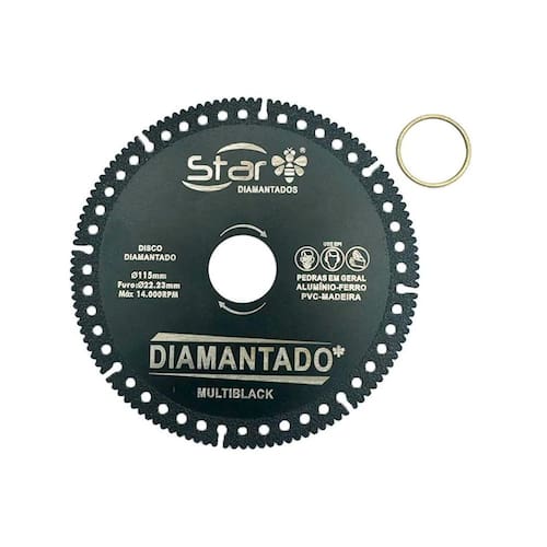Disco de corte multiblack 115mm de diâmetro com furo de 22,23mm de diâmetro acompanha anel de redução para reduzir o diâmetro de 22,23mm para 20mm .