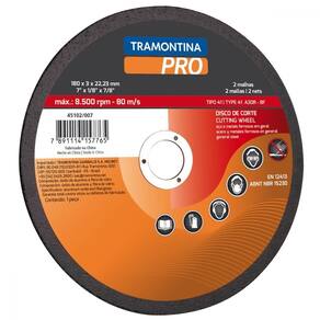 Disco produzido em óxido de alumínio;Corpo reforçado com 2 malhas de fibra de vidro;Anel interno de aço especial;Velocidade máxima de trabalho 80m/s - 13300 rpm;Modelo tipo 41 - A46T-BFEN12413ABNT NBR 15230Utilizado juntamente com esmerilhadeiras nos trabalhos de corte em aços e metais ferrosos em geral.Proporciona um excelente rendimento nas operações de corte;Todas as ferramentas são produzidas e testadas conforme normas específicas. Utilizado no corte de aços e metais ferrosos em geral, a linha de discos de corte da Tramontina PRO é produzida e testada para garantir segurança e resistência. A ferramenta certa para você que trabalha em manutenções industriais.