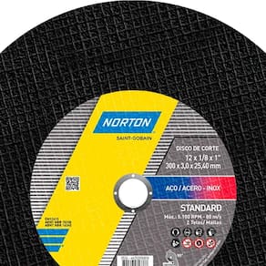 Produto: Disco de corte para metal e inox 12" x 1" x 3 mm - Standard Marca: Norton Descrição: O Disco de Corte para Metal e Inox 12" x 1" x 3 mm da Norton Standard é um acessório essencial para trabalhos de corte em metais. O Disco de Corte Norton foi projetado para excelência em operações de corte em aço carbono e inox. Seja para trabalhar com tubos, chapas, barras ou qualquer outro material robusto, este disco garante cortes precisos e rápidos, optimizando seu tempo e aumentando sua eficiência no trabalho. O Disco Standard confere não apenas performance superior, mas também segurança e durabilidade. Fabricado com materiais de alta qualidade, o disco de corte da Norton é a escolha perfeita para quem busca resultados profissionais em metalurgia e serralheria. • Tamanho ideal: Com um diâmetro de 12" e espessura de 3 mm, é ideal para cortes robustos e detalhados. • Material específico: Desenvolvido especialmente para aço carbono e aço inox, proporcionando cortes sem rebarbas e com menos faíscas. • Design otimizado: Oferece menor geração de calor durante o corte, minimizando o desgaste do material e do próprio disco. • Marca de confiança: Norton é um nome consolidado no mercado, sinônimo de qualidade e inovação em abrasivos. • Indicações de uso: Ideal para operações de baixa severidade, permitindo cortes rápidos sem comprometer a qualidade.Especificações: Diâmetro: 12” 300 mm Diâmetro do furo: 1” 25,4mm Espessura: 1/8” 3mm 2 TelasRotação máxima: 5.100 rpm / 80m/s. Marca: Não Informado Ean: 7891345817032