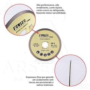 Este disco ELITE SUPERFLEX é a escolha ideal para cortes precisos em materiais como porcelanato, azulejo, piso cerâmico, ladrilho, mármore e pedra. Com espessura fina, garante acabamento perfeito, sem lascas, seja a seco ou refrigerado.