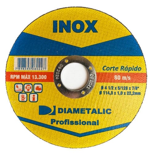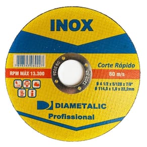 Informações técnicas: Tipo de corte: A seco Diâmetro externo: 115mm 4.1/4'' Diâmetro do furo: 22mm Rotação máxima por minuto: 15000 Para corte de Aço Inox Proporciona qualidade e produtividade na operação Produto de altíssima qualidade com alta performance Marca: Diametalic