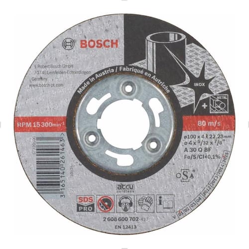 O Disco de Desbaste 4 Bosch é ideal para o desbaste de materiais em inox metal, sendo projetado para a limpeza de superfícies, desbaste de rebarbas, remoção de imperfeições de peças e muito mais. Diâmetro: 4 Função: Desbaste RPM: 15.300 Velocidade: 80 m/s Medidas: 4 X 5/32 X 7/8 Referência do Fornecedor: 2608600702