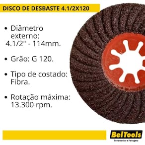 Indicação: Indicado para desbastes em metais ferrosos com esmerilhadeiras angulares. Com estrutura reforçada, é ideal para uso industrial. Diâmetro externo: 4.1/2" - 114mm. Grão: G 120. Tipo de costado: Fibra. Rotação máxima: 13.300 rpm.