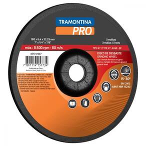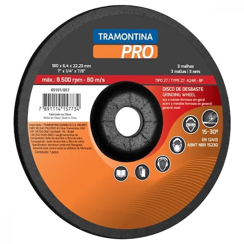 Disco produzido em óxido de alumínio;Corpo reforçado com 3 malhas de fibra de vidro;Velocidade máxima de trabalho 80m/s - 13300 rpm;Modelo tipo 27 - A24S-BFEN12413ABNT NBR 15230Utilizado juntamente com esmerilhadeiras nos trabalhos de desbaste em aços e metais ferrosos em geral.Proporciona um excelente rendimento nas operações de desbaste;Todas as ferramentas são produzidas e testadas conforme normas específicas. Utilizado no corte de aços e metais ferrosos em geral, a linha de discos de corte da Tramontina PRO é produzida e testada para garantir segurança e resistência. A ferramenta certa para você que trabalha em manutenções industriais.