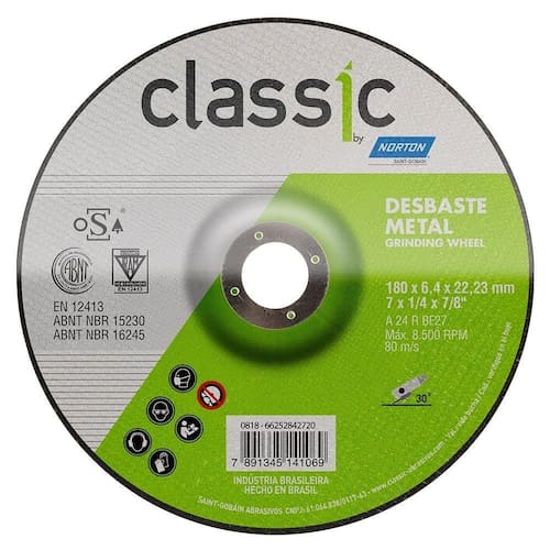 Características Principais: Marca: Norton Abrasivo: Óxido de alumínio Diâmetro: 180 mm (7") Espessura: 6,4 mm Furo central: 22,23 mm Rotação máxima: 8500 RPM