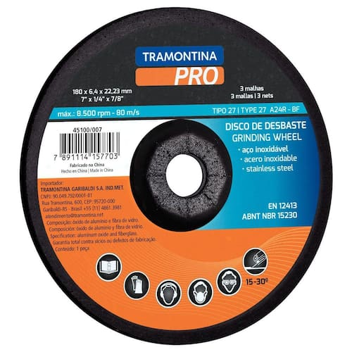 Utilizado no corte de aço inox, a linha de discos de corte fino da Tramontina PRO é produzida e testada para garantir segurança e resistência. A ferramenta certa para trabalhos em manutenções industriais Orientações Disco produzido em óxido de alumínio.Corpo reforçado com 3 malhas de fibra de vidro.Velocidade máxima de trabalho 80m/s - 13300 rpm.Modelo tipo 27 - A24S-BF.EN12413.ABNT NBR 15230.Utilizado juntamente com esmerilhadeiras nos trabalhos de desbaste em aços inoxidáveis.Proporciona um excelente rendimento nas operações de desbaste.Todas as ferramentas são produzidas e testadas conforme normas específicas. Características Gerais EAN13 7891114157710 DUN14 17891114157717 NCM 6804.22.11 Peso Líquido 0,5300 kg. Peso Bruto 0,5400 kg. Metragem 0,000317 m³. Dimensões Embalagem (Compr. X Larg. X Alt.) 230x 230x 6 mm. Dimensões Produto (Compr. X Larg. X Alt.) 230x 230x 6 mm. Dimensão Extra A 6,4 mm. Dimensão Extra B 230,0 mm. Dimensão Extra C 22,2 mm. Observações Use óculos, luvas de segurança, protetor auricular, máscara de proteção contra poeira e vestimentas adequadas de acordo com a tarefa a ser executada.Sempre manuseie e armazene os discos com cuidado.Antes da utilização, faça uma avaliação visual certificando-se que não haja danos ou trincas nos discos.Certifique-se que a velocidade do equipamento não exceda a velocidade máxima marcada nos discos.Utilize flanges de tamanho igual e modelo apropriado para cada tipo de disco.Sempre utilize o protetor de segurança do equipamento.Sempre que utilizar discos novos, antes da operação trabalhe com a máxima rotação, sem carga, por um minuto em área protegida. Tal procedimento tem o objetivo de verificar a integridade dos discos.Utilize apoio para os braços, se necessário.O ambiente de trabalho deve ser ventilado para evitar doenças respiratórias.Não utilize discos que foram expostos a umidade e temperaturas extremas.Não utilize discos que sofreram quedas ou que apresentem danos.No momento da montagem, não force os discos contra o equipamento ou altere o tamanho do furo central.Não aperte as flanges excessivamente.Não fique diretamente em frente aos discos durante a operação.Não utilize os discos para outros fins a não ser para os que foram projetados.Armazene em local limpo e seco.