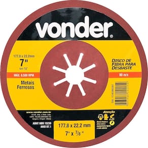 Marca: VonderConteúdo da Embalagem:1 Disco de fibra para desbasteDestaques e diferenciais:Devido as opções de grãos, realiza melhor acabamento se comparado aos discos de desbaste convencionaisAplicações e dicas de uso:Indicado para desbaste em metais ferrosos Características Técnicas:Diâmetro externo do disco de fibra para desbaste: 7 - 180 mm Diâmetro do furo do disco de fibra para desbaste: 7/8 - 22,22 mm Grão: G 40