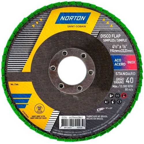 Produto: Disco de lixa flap disc côncavo 4.1/2" fibra - Standard Marca: Norton Grão: 40Descrição: O Disco de Lixa Flap Disc Côncavo 4.1/2" da Norton foi especiamente projetado para oferecer uma experiência superior em desbaste e preparação de superfícies, ideal para profissionais exigentes. Composto por aletas de lixa duráveis com costado de tecido e grão de óxido de alumínio, o Disco de Lixa Flap Disc Côncavo da Norton se destaca na categoria de entrada por sua performance notável. Se você busca resultados profissionais em manutenção e pequenos reparos, este é o produto que você precisa. Indicações do uso: Ideal para metais, aço carbono, e aço inoxidável. Especialmente desenvolvido para processos como remoção e nivelamento de superfícies, além de preparação para pintura. Alto rendimento, garantindo uma remoção eficaz do material com menos trocas de disco. Design côncavo, que proporciona um contato otimizado com a superfície de trabalho, aumentando a uniformidade e a qualidade do acabamento.Especificações: Medida: 4.1/2" 115 mm Diâmetro do furo: 22,23 mmCostado em fibraFormato: cônico.