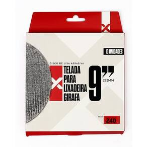 Diâmetro: 225mm 9 Grão: 240 Compatível com: Lixadeiras Girafa Material: Abrasivo telado de alta resistência Embalagem: Pacote com 10 unidades Marca: Não Informado