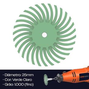 Roda de Polir Cerdas Radial 25mm Grão 1.000 Verde Claro para Micro Retíficas - Marca: Dremax - Referência: RPC006 - Cor: Verde Claro - Gramatura: Grão 1.000 fino - Material: Nylon + grãos de óxido de alumínio - Diâmetro: 25mm Pol. - Furo do centro do disco: 2mm - Trabalha em conjunto com hastes para disco de corte para micro retíficas - As escovas abrasivas radiais têm cerdas muito flexíveis, que permitem a remoção da camada superficial exterior sem danificar a camada de base abaixo - Ótimo para polir pedra, madeira, alumínio, latão, bronze, aço carbono, ferro fundido, aço inoxidável e outros metais - A escova de cerdas radiais é indicada para metalurgia, preparação de tinta, revestimento e remoção de corrosão e muito mais - As cerdas flexíveis requerem menos pressão do que as escovas de aço e adaptam-se aos contornos, mesmo em peças complexas - Nossos discos de polimento detalhados são adequados para rebarbação, limpeza, acabamento, usinagem e polimento de peças detalhadas, áreas minúsculas e locais irregulares - Os discos de cerdas podem ser empilhados, flexíveis, frescos, duráveis e fornecem um acabamento uniforme. Use quantos discos forem necessários - Garantia: 90 dias contra defeitos de fabricação A DREMAX é a primeira e única marca brasileira dedicada exclusivamente às micro retíficas, acessórios e acoplamentos para esta indispensável ferramenta. Seja para trabalhos de precisão, artesanato, modelagem ou reparos, a DREMAX tem o produto certo para você. Marca: Dremax