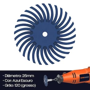 Roda de Polir Cerdas Radial 25mm Grão 120 Azul para Micro Retíficas - Marca: Dremax - Referência: RPC003 - Cor: Azul Escuro - Gramatura: Grão 120 Grosso - Material: Nylon + grãos de óxido de alumínio - Diâmetro: 25mm Pol. - Furo do centro do disco: 2mm - Trabalha em conjunto com hastes para disco de corte para micro retíficas - As escovas abrasivas radiais têm cerdas muito flexíveis, que permitem a remoção da camada superficial exterior sem danificar a camada de base abaixo - Ótimo para polir pedra, madeira, alumínio, latão, bronze, aço carbono, ferro fundido, aço inoxidável e outros metais - A escova de cerdas radiais é indicada para metalurgia, preparação de tinta, revestimento e remoção de corrosão e muito mais - As cerdas flexíveis requerem menos pressão do que as escovas de aço e adaptam-se aos contornos, mesmo em peças complexas - Nossos discos de polimento detalhados são adequados para rebarbação, limpeza, acabamento, usinagem e polimento de peças detalhadas, áreas minúsculas e locais irregulares - Os discos de cerdas podem ser empilhados, flexíveis, frescos, duráveis e fornecem um acabamento uniforme. Use quantos discos forem necessários - : 90 dias contra defeitos de fabricação A DREMAX é a primeira e única marca brasileira dedicada exclusivamente às micro retíficas, acessórios e acoplamentos para esta indispensável ferramenta. Seja para trabalhos de precisão, artesanato, modelagem ou reparos, a DREMAX tem o produto certo para você. Marca: Não Informado Ean: 7734625992060