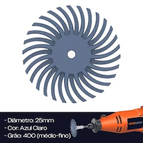Roda de Polir Cerdas Radial 25mm Grão 400 Azul Claro para Micro Retíficas - Marca: Dremax - Referência: RPC004 - Cor: Azul Claro - Gramatura: Grão 400 médio-fino - Material: Nylon + grãos de óxido de alumínio - Diâmetro: 25mm Pol. - Furo do centro do disco: 2mm - Trabalha em conjunto com hastes para disco de corte para micro retíficas - As escovas abrasivas radiais têm cerdas muito flexíveis, que permitem a remoção da camada superficial exterior sem danificar a camada de base abaixo - Ótimo para polir pedra, madeira, alumínio, latão, bronze, aço carbono, ferro fundido, aço inoxidável e outros metais - A escova de cerdas radiais é indicada para metalurgia, preparação de tinta, revestimento e remoção de corrosão e muito mais - As cerdas flexíveis requerem menos pressão do que as escovas de aço e adaptam-se aos contornos, mesmo em peças complexas - Nossos discos de polimento detalhados são adequados para rebarbação, limpeza, acabamento, usinagem e polimento de peças detalhadas, áreas minúsculas e locais irregulares - Os discos de cerdas podem ser empilhados, flexíveis, frescos, duráveis e fornecem um acabamento uniforme. Use quantos discos forem necessários - : 90 dias contra defeitos de fabricação A DREMAX é a primeira e única marca brasileira dedicada exclusivamente às micro retíficas, acessórios e acoplamentos para esta indispensável ferramenta. Seja para trabalhos de precisão, artesanato, modelagem ou reparos, a DREMAX tem o produto certo para você. Marca: Não Informado