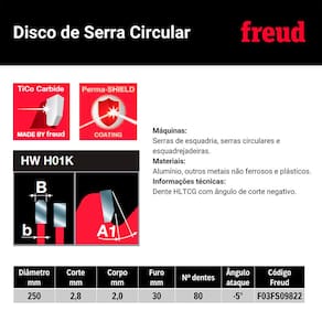 Características Marca: Freud Modelo: FR23A001M Diâmetro do disco: 250mm (10Pol) Número de dentes: 80D Garantia: Contra defeito de fábrica