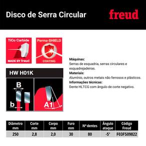 Características Marca: Freud Modelo: FR23A001M Diâmetro do disco: 250mm (10Pol) Número de dentes: 80D Garantia: Contra defeito de fábrica