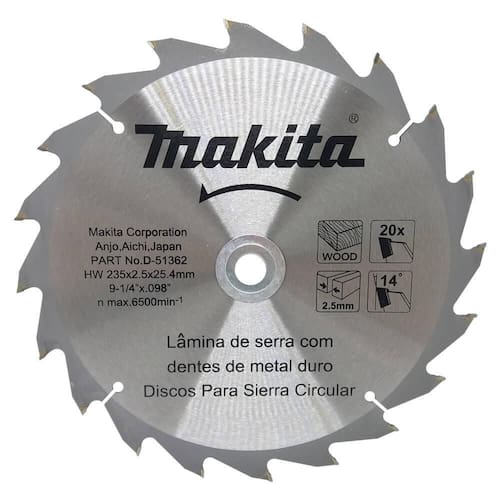 O Disco de Serra Circular Makita é especialmente desenvolvido para cortes em madeira com maior segurança. É muito utilizado por marceneiros para trabalhos com MDF e diversos outros tipos de madeira, utilizando serras circulares portáteis ou serras circulares equipadas com capa de proteção retrátil para serra. Benefícios O Disco proporciona cortes mais suaves sem esforço com os dentes totalmente afiados, além de serem selecionados garantindo uma boa vida útil. O Disco de Serra Circular Makita é super, versátil sendo extremamente apropriado para todos os tipos de madeira. Características: É composto de dentes muito afiados para cortar todo tipo de madeira, seja compensada, dura, macia e mdf. O Disco de Serra Circular Makita possui uma tecnologia em suas pontas de metal, sendo mais duro que seus concorrentes garantindo maior poder de corte. Especificações Técnicas: Diâmetro: 235 mm ou 9-1/4 Diâmetro do furo: 25 mm ou 1 Número de dentes: 20 Rotação Máxima: 6500 rpm Conteúdo da Embalagem: - 01 disco serra circular : 3 meses. Imagem meramente ilustrativa. As cores podem variar conforme monitor/smartphone utilizado para a visualização do anúncio ou até mesmo pela percepção do usuário. Objetos de decoração das fotos não estão inclusos. Ean: 088381442763