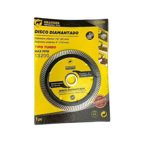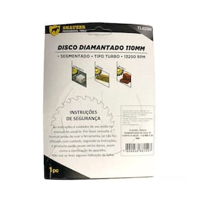 Disco De Serra Circular Diamantado 4110MM Snauzer TL42200 Disco Diamantado De Aço Para Corte a Seco 110 MM x 20MM Produto de alta qualidade e durabilidade. Compatível com serra mármore e esmerilhadeiras. Ideal para corte de pedras mármore, granito, ardósia, goiás, refratário e outros ,concreto e bloco. Também corta com facilidade outros materiais como concreto, reboco, tijolo, telhas e contra piso. Especificações: Disco turbo Velocidade: 13.200 rpm Material: aço, bordas com diamante sintético Diâmetro do disco: 110mm Diâmetro do furo: 22mm Espessura das bordas: 1,8mm Comprimento das bordas: 8mm