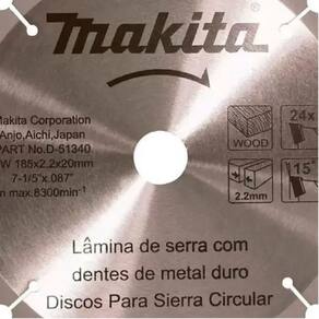 Características Gerais do Produto: - Modelo: D-51340 - Marca: Makita - Diâmetro: 185 mm; Furo: 20 mm - Características: Dentes de metal duro; Anel de redução: 15.88; Dentes: 24 - Ideal Para: Corte em madeira em geral - Garantia direto com o Fabricante: 3 Meses Contra Defeitos de Fabricação Garantia: - Sem Garantia