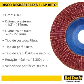 Grão: G 70. Diâmetro externo: 4.1/2" - 114mm. Diâmetro do furo: 7/8" - 22,2mm. Tipo de costado: Fibra. Tipo do perfil: Reto. Tipo do grão: Óxido de zircônio. Rotação máxima: 13.300 rpm. Velocidade periférica: 80 m/s.