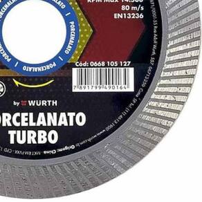 Produto: Disco diamantado 105 x 20 mm turbo fino porcelanato - W-Max Marca: Wurth Descrição: O Disco diamantado 105 x 20 mm turbo fino porcelanato W-Max da Wurth é essencial para profissionais que buscam excelência em suas obras. Especialmente projetado para corte em Porcelanato, Mármore, Cerâmica, Azulejos e Pisos. Características • Alto Rendimento: Rápido e eficiente, permite cortes onde o tempo e a qualidade são cruciais. • Versatilidade: Ideal tanto para uso a seco quanto molhado, adaptando-se perfeitamente às condições de trabalho. • Acabamento Superior: Projetado para reduzir lascas, garantindo um acabamento fino e liso, aumentando a qualidade visual de suas peças. • Menor Vibração: Conte com cortes mais suaves e seguros, graças ao design que minimiza as vibrações. Restrições de uso: É importante seguir as instruções para garantir a segurança e a longevidade do disco: nunca exceda a rotação máxima, use apenas em máquinas apropriadas, e evite cortar materiais não fixados corretamente.Especificações: Tipo: Turbo FinoDiâmetro: 105 mmAltura do Segmento: 7,0 mmEspessura do Núcleo: 1,00mmRotação Máxima: 14500 RPMEspessura da Coroa: 1,3mm. Marca: Não Informado