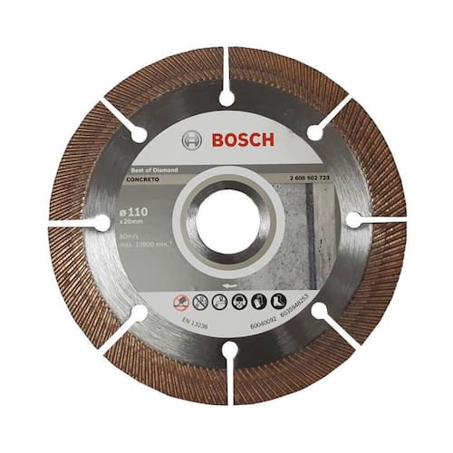 Disco Diamantado 110mm BPP Turbo Segmentado 2608602723 Bosch O disco diamantado Standard for Concrete segmentado oferece cortes boa qualidade de corte em concreto; A matriz de diamante otimizada oferece resultados sólidos graças aos padrões de alta qualidade do disco; O Disco de Corte Diamantado Bosch proporciona alta qualidade em seus cortes, pois possui um aro de corte contínuo que atinge resultados preciso em diversos tipos de concretos. - Ideal para cortes em concretos e alvenarias - Maior vida útil e qualidade no corte - Utilizado em serra mármore Dados Técnicos: - Diâmetro Externo: 110mm - Diâmetro do Furo: 20mm - Altura total da borda: 10mm - Rpm Máximo: 13800 rpm - Referência: 2608602723 Imagem meramente ilustrativa de 6 meses oferecido pelo fabricante Código: 139052 EAN: 3165140594172 Marca: Não Informado Ean: 3165140594172