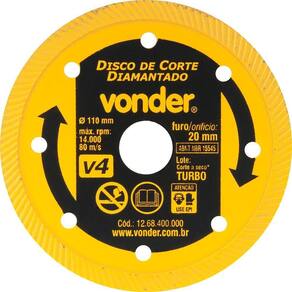 Conteúdo da embalagem1 Disco de corte diamantadoAplicações e dicas de usoIndicado para cortar cerâmica. Não indicado para porcelanato. Pode ser utilizado para cortar concreto, pedras e tijolos. Os discos de corte a seco, quando refrigerados proporcionam um melhor rendimento.Destaques e diferenciaisMaior velocidade de corte, aumentando o rendimento do trabalho. Acompanha bucha de redução de 20 mm para 16 mm. DETALHES TÉCNICOS Diâmetro externo do disco de corte diamantado: 110 mm Diâmetro do furo do disco de corte diamantado: 20 mm Refrigeração: A seco Perfil do corte: Turbo Rotação máxima rpm : 14000 rpm Segue norma: ABNT NBR 15545