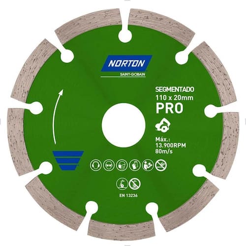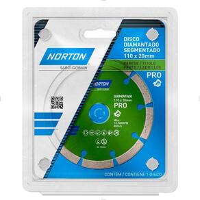 Seco Composição: Metal, diamante sintético e liga Referência: 70184624361 Código EAN: 7895316575914 Modelo: PRO SEGMENTADO Marca: NORTON Segue norma: EN 13236 Medidas: 110mm Espessura do segmento diamantado: 1,9 mm Massa aproximada peso : 0.112 kg