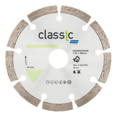 Descrição O Disco Diamantado 110 X 22,23mm Norton Classic Segmentado foi projetado para ser utilizado em operações simples do dia a dia, sendo ideal para o corte em concreto, tijolo, telha e alvenaria.