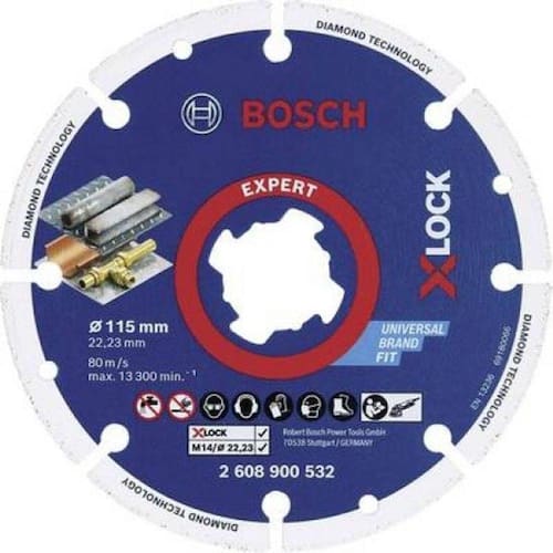 Destaques do produtoPrato diamantado X-LOCKA Diamond Metal Wheel X-LOCK tem vida útil até 100 vezes maior ao cortar metal.O corpo de aço com borda de corte diamantado é extremamente robusto e o disco mantém uma profundidade de corte e velocidade constantes ao longo de sua longa vida útil.Com a Diamond Technology da Bosch, o disco não estilhaça se cair e não produz cheiro de produto químico ou poeira extra durante o corte.A troca de discos é rápida e conveniente, graças ao sistema X-LOCK sem chave.Descrições do produtoA Diamond Metal Wheel X-LOCK tem vida útil até 100 vezes maior ao cortar metal. Seu corpo de aço com borda de corte diamantado é extremamente robusto e o disco mantém a mesma profundidade de corte e velocidade constante ao longo de sua longa vida útil. Graças à Diamond Technology da Bosch, o disco não estilhaça se cair e não produz cheiro de produto químico ou poeira extra durante o corte. Destina-se ao corte de metais, incluindo aço, ferro fundido, aço inoxidável e cobre. A Diamond Metal Wheel da Bosch atende aos mais altos requisitos de segurança, como a norma EN 13236. A Diamond Metal Wheel X-LOCK também se adapta às esmerilhadeiras angulares