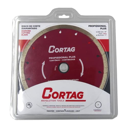 Disco de Corte Diamantado Contínuo 200x25,4mm Cortag Características da Ferramenta: Cerâmica, Azulejo, Telha, Tijolo e Porcelanatos Indicado para uso nos Cortadores Elétricos ZAPP 200 e ZAPP 1250 Imagem ilustrativa Dados Técnicos: Perfil: Contínuo Diâmetro do Disco: 200mm Diâmetro do Furo: 25,4mm Tipo de corte: Refrigerado Peso do produto: 0,400kg Rotação:7.500 rpm Acompanha 1un. Disco de Corte Diamantado Contínuo 200x25,4mm Cortag 90 dias fornecido pelo fabricante contra defeitos de fabricação Especificações: Código: 195131 Modelo: 60570 Código EAN: Marca: Não Informado