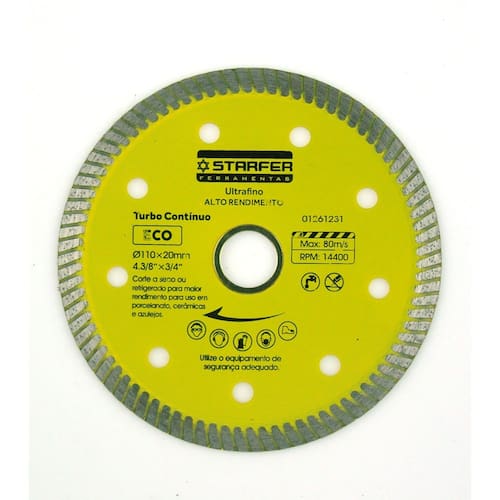 Disco diamantado Starfer Eco continuo é utilizado em azulejos, pisos, porcelanatos,mármore Corte a seco ou refrigerado. Disco em Aço Carbono com Lamina Diamantada Continua Turbo, para corte a seco ou refrigerado. Dimensoes: Diametro do Disco 4.3/8 110MM X Diametro do Furo 3/4 20MM X Espessura da Lamina 8MM. Para Uso em Serra Marmore. Limite Maximo 14400RPM, 80M/S.Indicado para Corte Ultrafino com Acabamento Liso em Porcelanatos, Ceramicas e Azulejos. Embalagem: Cartela Blister com 10 Discos.