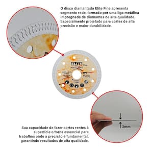 O Disco de Corte Diamantado Elite Fine é indispensável para cortes precisos e eficientes em porcelanatos e outros materiais delicados. Com um design de segmento rede e diamantes de alta qualidade, oferece precisão superior e maior durabilidade, sendo a escolha ideal para acabamentos impecáveis.