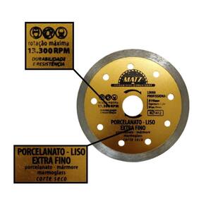 Disco de corte diamantado liso, ideal para cortes secos em porcelanato, mármore e marmoglass. Com alta durabilidade e precisão, oferece cortes rápidos e limpos, garantindo um acabamento suave sem lascas. Seu design liso proporciona menor desgaste, aumentando a vida útil do disco.