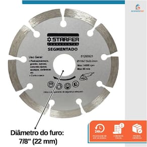 O Disco Diamantado Segmentado Starfer é a escolha ideal para cortes precisos e eficientes em materiais como mármore, granito, concreto, tijolos, telhas, azulejos e cerâmicas. Projetado para oferecer alta durabilidade e desempenho, ele conta com uma lâmina segmentada de aço carbono revestida com diamante, garantindo cortes rápidos e menos desgaste.