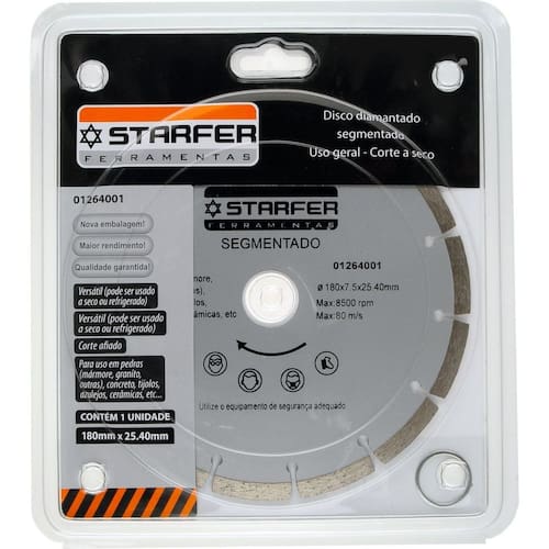 Disco diamantado Starfer segmentado 7 é utilizado nos cortes de Basaltos, pedras naturais abrasivas, Goiás, Miracema e Mineira, lajotas, contrapisos de cimento, concretos, concreto armado, vigas de concreto, alvenaria, tijolos baianos, tijolos de concreto, refratários e telhas coloniais. Disco em Aço Carbono com Lamina Diamantada Sagmentada,para corte a seco ou refrigerado. Dimensoes: Diametro do Disco 7 25,4MM X Espessura da Lamina 7.5MM. Para Uso em Serra Marmore. Limite Maximo 8500RPM, 80M/S.Indicado para Cortar Pedras, Marmore, Granito, Concreto, Tijolos, Telhas, Azulejos e Ceramicas