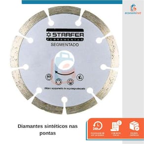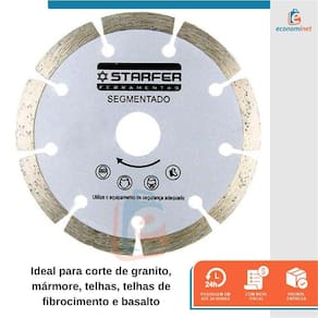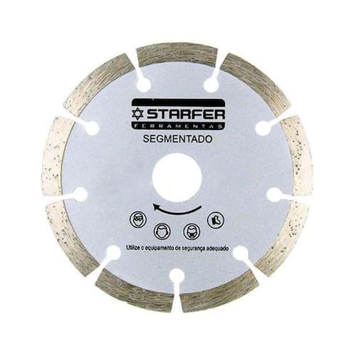CARACTERÍSTICAS TÉCNICAS: Material: Aço Carbono com lâmina diamantada Medidas: 180mm altura x 25,4mm - 7 diâmetro x 7,5mm espessura Máxima rotação: 8.500rpm - 80m/s Marca: Starfer Ref.: 1264001 Ean: 7891638992224