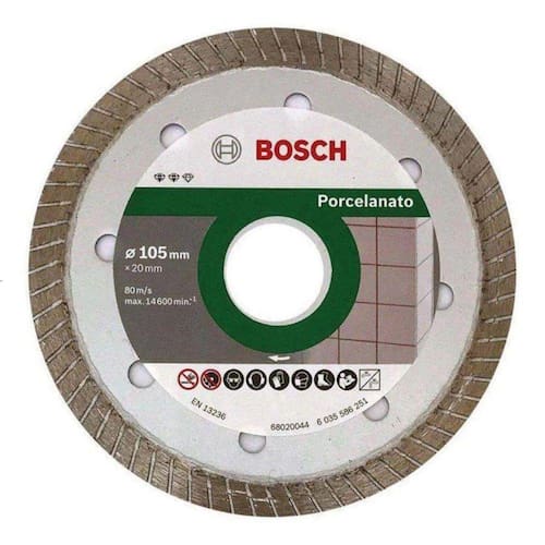 Especificações do disco diamantado turbo fino bosch: Aplicações: porcelanatos, azulejos, cerâmicos, cerâmicas e ladrilhos. Espessura do disco: 1,2mm Diâmetro do disco: 105mm - 4 Diâmetro do furo: 20mm Max. Rpm: 14.600