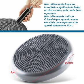 Fabricado em PVC resistente, o Disco de Equilíbrio Inflável tem 33 cm de diâmetro e acompanha uma bomba manual com bico dupla função: acoplado à bomba para inflar e desacoplado para desinflar o disco. Pode ser usado como massageador, em treinamentos funcionais e exercícios de fortalecimento (cheio), e pode ser usado também como almofada para sentar, proporcionando distribuição uniforme do peso do corpo e maior conforto para pessoas que passam muito tempo do dia sentadas.