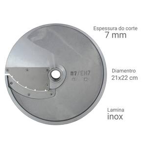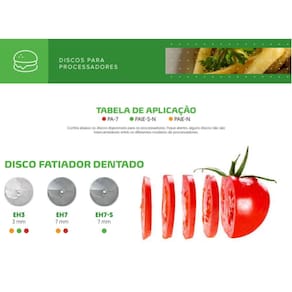 Características Técnicas: Ideal para o preparo de couve, tomate e alimentos de textura similar Espessura do corte: 7 mm Diâmetro do disco: 20,5mm Função do disco: fatiar alimentos Compatível modelos: PAIE-S-N Lâmina em Aço Inox Modelo: EH7-S